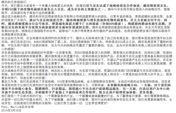 今天,我要向大家正式宣布一个好消息:2014年3月10日,公司与腾讯达成战略合作协议——京东将收购腾讯旗下QQ网购和拍拍网的100%权 益,以及易迅网的部分股份,腾讯将为京东提供微信和手机QQ客户端的突出入口位置以及其他关键平台支持,此外,双方还将在在线支付服务领域进行合作。